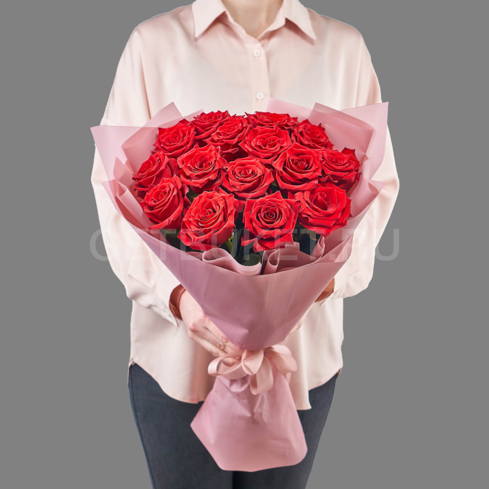 Букет из 15 красных роз в упаковке